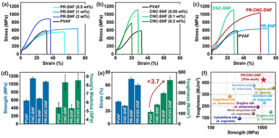 材料的增强增韧是高分子材料的重点研究方向,也是一直以来的研究难点。天然蜘蛛丝具有优异的力学强度、延展性、韧性等,是力学强韧性能结合最好的材料之一。蜘蛛丝优异的机械性能主要源于其多级结构。其一级结构是β-片状纳米晶为交联点以及富甘氨酸无定形区,通过纳米晶交联提高蜘蛛丝力学强度,通过无定型区提高蜘蛛丝的延展性;其二级结构是β-片状纳米晶中取向排列的β-strands,并通过黏滑形变提供能量耗散进一步提高蜘蛛丝的延展性和韧性。通过模仿蜘蛛丝结构来实现材料的增强增韧是一直以来的研究热点,但是要真正想达到蜘蛛丝优异的综合力学性能,仍然是一个挑战。