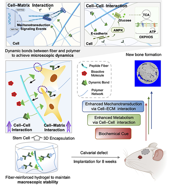 基于此,华南理工大学生物医学科学与工程学院边黎明教授团队设计开发了一种多肽纤维-高分子复合水凝胶,其中具有坚硬β-片层的肽纤维可以增强水凝胶的宏观稳定性、肽纤维与聚合物网络之间的动态亚胺键能够同时赋予水凝胶微观动态性。所得到的纤维复合水凝胶具有及时适配细胞行为的动态网络,其可以增强细胞与基质以及细胞之间的相互作用,从而通过力学信号转导-能量代谢耦合作用促进干细胞的成骨分化。此外,肽纤维负载的诱导性化合物可以进一步提高骨再生水平。相信通过模拟天然细胞外基质的生物物理与生物化学特性可以为细胞适应性以及生物活性材料的设计提供帮助。