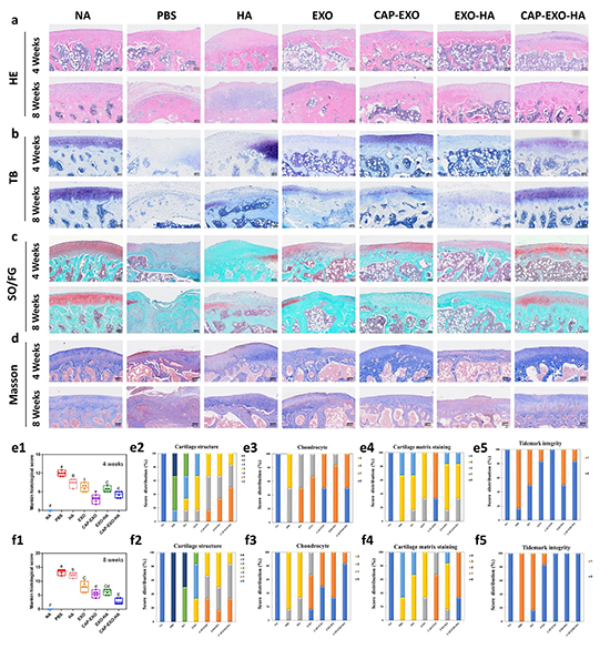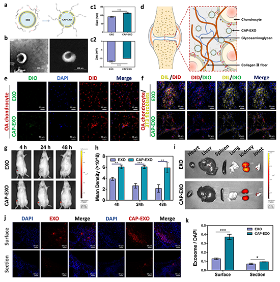 图5. 具有软骨细胞特异性靶向和体内缓释功能的外泌体显示出良好的OA治疗效果