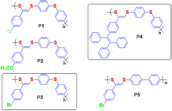 研究团队在优化聚合反应条件的基础上,通过这条路线合成了多种聚合物,图2是其中有代表行的几个聚合物,其中的P3是图1中得到聚合物。这个聚合反应的一个特点是:得到的聚合物具有高度的区域结构专一性,主链上的乙烯双键采取全顺式构型(见图2)。文中给出了详细的解释,有综合性的光谱学表征数据,有精心设计的模型反应,还有DFT理论计算的强大辅助。对于取代烯烃来说,产物存在着顺反异构体。就区域结构而言,顺式结构不如反式结构稳定;但是理论计算表明,在苯硫酚阴离子与1-苯基2-溴乙炔的加成反应中,巯基负离子进攻炔基上与苯环相连的C碳原子、且采取顺式构型的反应机理具有能量最低的过渡态。