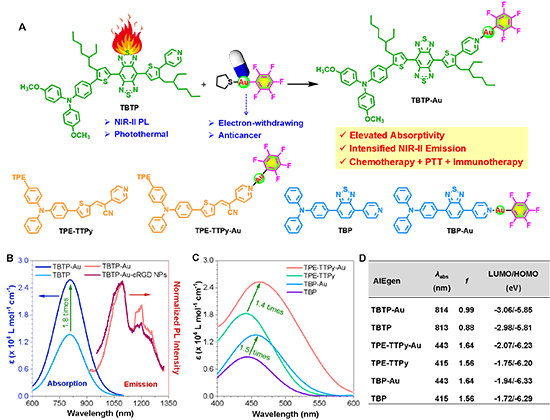 癌症已成为严重危害人类健康的重大公共卫生问题。目前,在癌症诊断和治疗方面,仍然面临巨大挑战。荧光成像(FLI)技术作为一种新兴的成像方式,由于其操作简单、灵敏度高等优点,在临床诊断中显示出巨大的应用前景。具有长波发射的近红外二区(NIR-II)材料可实现深层组织穿透、高空间分辨率及高信噪比的荧光成像。然而,这些NIR-II发光系统通常需要引入大而复杂的π共轭骨架来延长吸收及发射波长,合成难度高且易引起聚集引起的淬灭(ACQ)现象。相比之下,具有聚集诱导发光(aggregation-induced emission, AIE)特性的供体-受体(D-A)型扭曲结构的体系不仅可以拓宽吸收和发射,还能获得高效的发光,以实现深部、高空间分辨率的荧光成像。遗憾的是,由于AIE体系通常以扭曲的结构存在,且包含诸多转子,导致其吸收率较低,进而制约了其发光效率和依赖非辐射衰减途径的光疗效果。因此,迫切需要开发一种新的策略来解决AIEgens低吸收率的问题,这也是目前新材料开发中普遍存在的挑战。