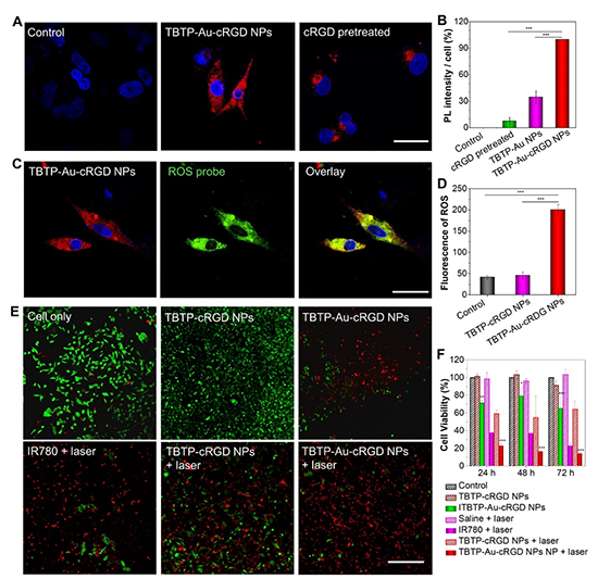 (2)为了更好的将目标金配合物TBTP-Au应用于活体靶向成像和抗癌治疗,作者制备了具有高肿瘤特异性的TBTP Au-cRGD 纳米粒子(图3A)。由于TBTP-Au自身较高的光热转换效率以及Au(I)特异性的肿瘤抑制性能(Angew. Chem., Int. Ed. 2020, 59, 7097),制备的TBTP Au-cRGD 纳米粒子通过光热治疗(PTT)协同化疗途径在细胞水平表现出较好的肿瘤靶向性及抗肿瘤性能(图4)。
