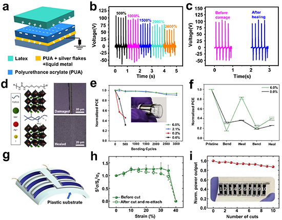 就可自我修复的电子设备而言,一个重大的挑战是平衡和优化不同应用的多种特性。对于能量转换/存储设备,通过在摩擦层、粘合剂、电极和电解质的设计中应用自愈合概念,已经成功地展示了自愈合纳米摩擦发电机、钙钛矿太阳能电池、锂离子电池和超级电容器。然而,应该指出的是,迄今为止报道的大多数自愈聚合物距离实际应用还很远。具体来说,大多数自愈聚合物需要热等外部能量来触发或加速愈合过程,这在设备的实际运行中很难实现。因此,开发能够在温和条件或室温下实现自愈的高分子材料是非常可取的。此外,另一个挑战在于设计具有合适自愈能力的自愈聚合物,同时具有高导电性,这无疑是未来自愈电子的主要研究方向。另外,由于需要更多的合成步骤和化学改性过程,用于储能转换/设备的自愈聚合物通常比商用聚合物更昂贵。进一步缩短商业化进程,降低制造成本,同时保证高性能也是迫切需要解决的关键问题。