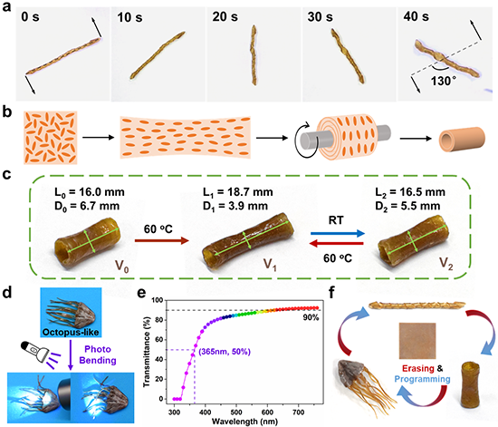 基于液晶弹性体的软体驱动器具有驱动性能优异、质量轻和可无线操控等诸多优点,在医疗器械、智能纺织、机器人等应用领域具有广阔的应用前景。然而,液晶软体驱动器的制备工艺复杂,通常需要两步甚至多步操作才能完成,同时制备过程伴随着高温或紫外光的使用,且所得材料的形状和驱动模式无法根据应用需求进行灵活调整,因此限制了其实际应用。引入非共价键替代共价键作为网络的交联点是简化液晶弹性体制备工艺、得到具有定制化形状的驱动器的一种可行方法。然而,如何构建兼具优良驱动性能和加工性能的液晶弹性体仍是一个挑战。