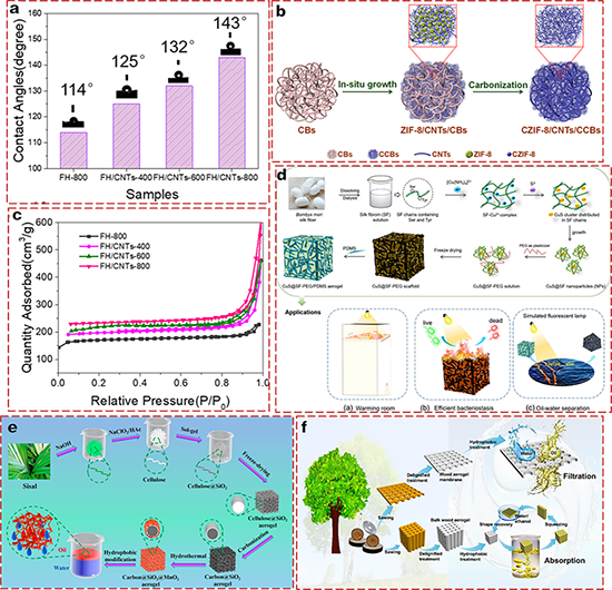 图7(a)FH/CNTs-x的WCA和比表面积;(b)Zif-8/CNTs/CCBs的制备示意图;(c)CuS@SF-PEG/PDMS气凝胶的形成过程示意图及其在土布和工业材料中的潜在应用;(d)改性HBCSM气凝胶制备示意图;(e)多功能油水分离用木质气凝胶材料的制备及原理图。
