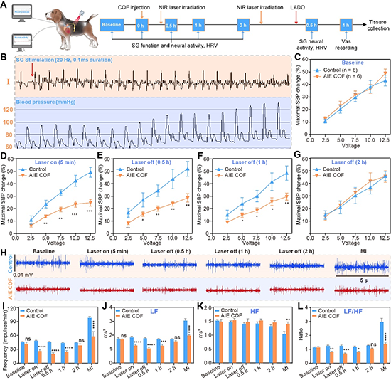 6.首次将AIE COF介导的光热效应用于神经调控防治大型犬类动物急性心肌梗死后恶性心律失常的发生,这种非药物、非侵袭性的无创可逆神经调控策略,有助于在心肌梗死患者中降低恶性心律失常等不良事件发生率,从而发挥心脏保护作用,进一步拓展了神经调控防治心血管疾病的临床应用价值。