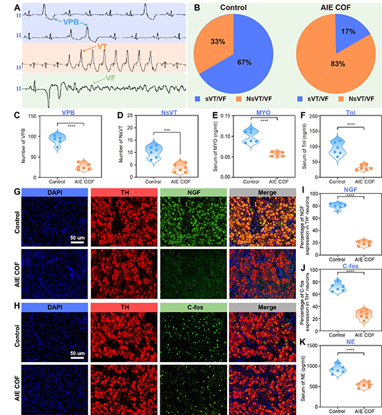 2.AIE COF介导的局部光热可显著抑制心肌梗死后过度激活的交感神经节功能与神经活性,改善心脏电生理性质,从而有效防治心肌梗死后的恶性室性心律失常和心源性猝死事件。