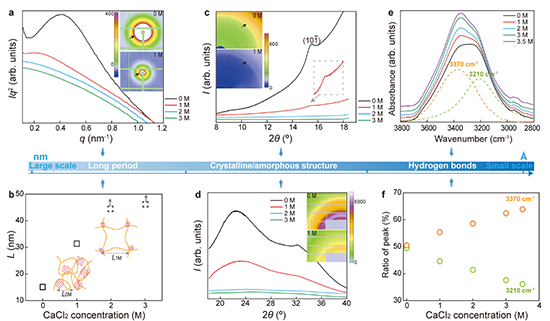 近期,青岛大学生物多糖纤维成形与生态纺织国家重点实验室王莉莉副教授与青岛大学未来研究院金明亮教授合作,采用受限冷冻策略成功制备出非晶形、多功能冷冻水凝胶。以结构易控的聚乙烯醇为冷冻水凝胶模型聚合物,与传统增强分子链聚集思路相反,巧妙利用小分子抗冻剂,原位抑制冷冻水凝胶成形过程中的冰晶生长行为,从而构建微小尺寸冰晶的受限冷冻外场;这大大降低前驱液冰晶生长对高分子链的排挤作用,分子链发生小幅度、相对均相靠近的结构演变,这种新型结构成形机制实现交联网络的非晶化,且增大的分子链间距释放部分自由极性基团,体系实现氢键键合羟基与自由羟基的共存。