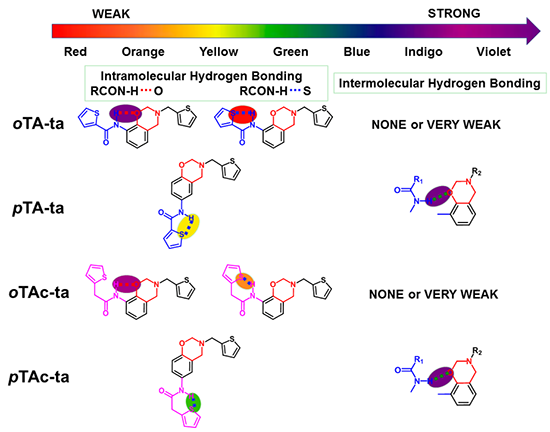 图2. 苯并噁嗪单体结构中氢键形式及相对强弱关系。