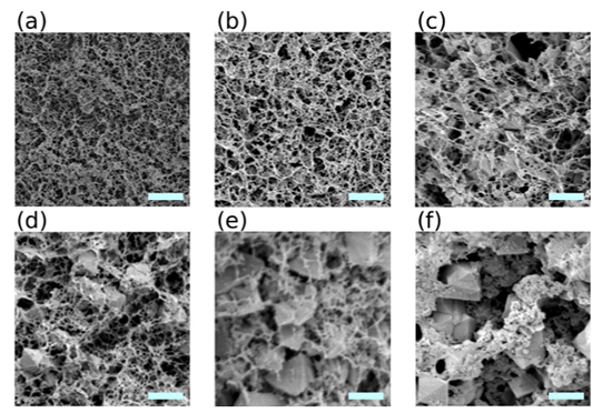 图3 (a) PVA、(b) OCN/PVA、(c-f) MIL-100(Fe)OCN/ PVA气凝胶的SEM图像。