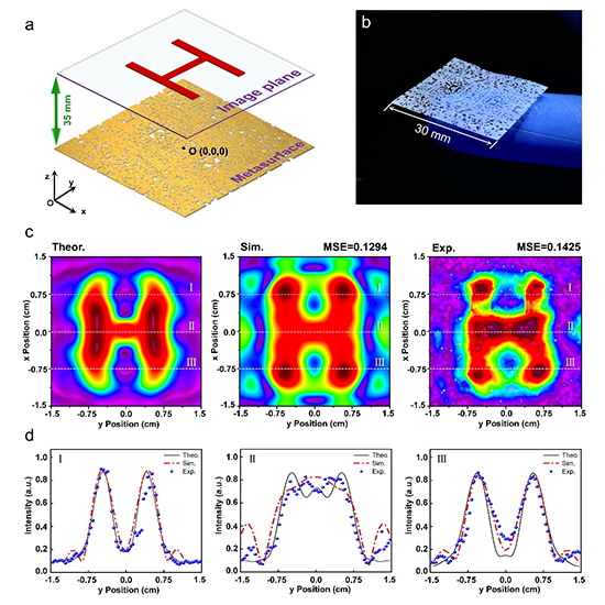 图3:剪裁加工的成像超透镜及其远场高分辨二维、三维超声脉冲-回波成像。