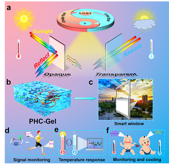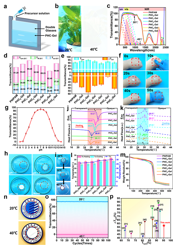 据相关统计,每年建筑能耗约占总能耗的40%,同时极端天气下室内温度的可控性对人们来说也是一项巨大的挑战。因此,具有太阳光调制能力的智能窗引起了研究者们的广泛关注。然而,大多数新兴的智能窗材料或多或少存在低温下透明度低、相变温度高、应用领域局限等缺点。因此,开发光学性能优异及应用领域广泛的热致变色水凝胶已成为人们关注的焦点。基于此,本研究以明胶、PNIPAM、HPC 和 CMC为原料,通过简单的“一锅法”制备了一种具有温度和 pH 双重响应的自适应热致变色水凝胶(PHC-Gel)。PHC-Gel水凝胶具有优异的可见光透射率(~ 95.2%)和良好的太阳光调节能力(~ 57.2%)。与此同时,PHC-Gel的低临界溶解温度(LCST)也可在20 ℃~35 ℃ 的温度范围内自由调控。
