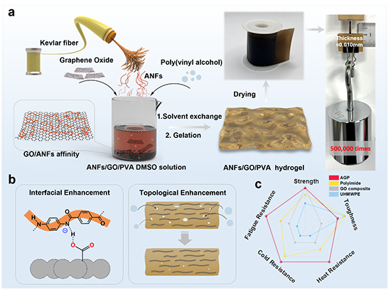 图1. 芳纶纳纤基复合膜的设计、制备与性能。(a) 溶液-凝胶-固体转化过程。(b) 增强机理。(c) 复合膜性能对比的雷达图。