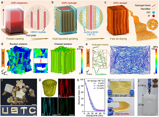 图1. 芳纶气凝胶的制备过程、骨架和纤维网络的拉伸过程模拟、以及气凝胶实物图