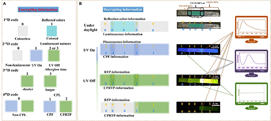 圆偏振室温磷光(CPRTP)材料在光学防伪与信息加密领域具有重要的应用价值。然而,目前CPRTP材料的发展仍面临一些挑战,例如现有的CPRTP材料的发光不对称因子(glum)通常仅在10-3~10-2范围内,远低于理论最大值2.0。另外,材料体系一旦确定,CPRTP的性质即被固定,从而无法对外界的刺激做出响应,阻碍了其在智能材料领域的应用。近日,北京化工大学郭金宝教授课题组在Cell旗下物质学子刊《Cell Reports Physical Science》上发表了题为“Tunable circular polarization room temperature phosphorescence with ultrahigh dissymmetric factor by cholesteric liquid crystal elastomers”的研究论文。本研究中,将具有较大体积位阻的磷光分子四苯基联苯二胺(TPB)与胆甾相液晶弹性体(CLCE)结合,成功实现了最大glum为0.93的可调控CPRTP材料(图1)。相比之前报道的CPRTP材料,该体系的glum得到了大幅的提高。同时,材料软弹性的特点以及动态共价键的性质赋予了CPRTP刺激响应的功能。当存在力-热负载时,成功实现了CPRTP的glum在0.93和0之间的可逆切换。此外,利用该材料的反射色-荧光-室温磷光-圆偏振发光的优异性能,进一步探索了在4D信息存储与加密领域的应用。这项研究对于开发基于软弹性基质的圆偏振室温磷光材料具有重要的指导意义,并在高性能的可调控CPRTP以及光学信息加密领域获得了突破性进展。