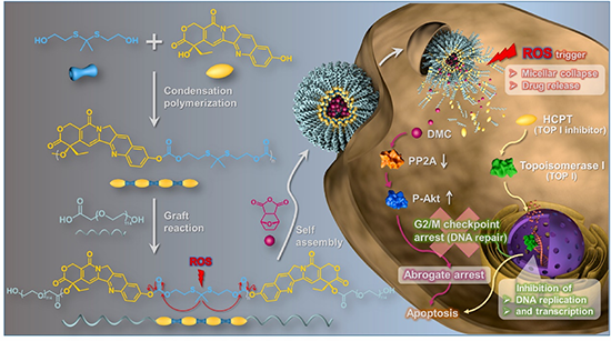 联合化疗是临床上提高疗效和避免多药耐药性的常用策略。然而,静脉给药后很难确保协同药物在病变部位的共富集。将协同药物整合到纳米载体中除了可以提高药物的稳定性、靶向性和载药量以外,还可以确保协同药物在同一个靶细胞中发挥作用。本研究使用10-羟基喜树碱(HCPT)构建聚合物前药胶束,并将去甲基斑蝥素(DMC)按比例包封在胶束中。在活性氧(ROS)的触发下,HCPT和DMC同时从共递送载体中释放。DMC通过抑制细胞周期检查点激酶蛋白磷酸酶2A(PP2A)的合成来促进异常细胞分裂,从而增加细胞对DNA损伤、复制紊乱和死亡的敏感性。该共递送载体在动物实验中表现出良好的生物安全性和优秀的抗肿瘤效果,可以为临床联合化疗方案转化为纳米药物递送系统提供有价值的参考。