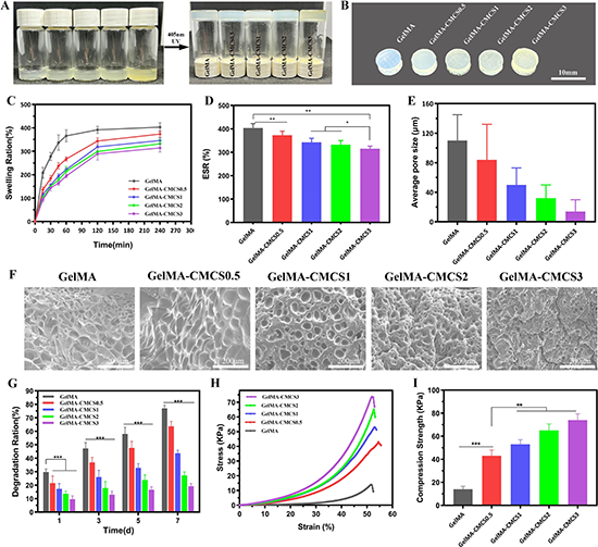 图3. GelMA-CMCS水凝胶的结构,固化性能,溶胀和降解能力,力学表征