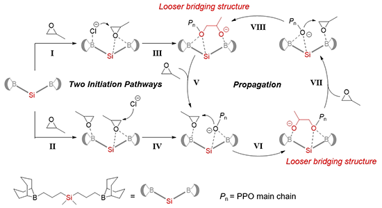 为了解释这种双组份催化剂反常的高催化活性和抗稀释效应,作者通过19F核磁和密度泛函理论计算对催化机理进行了研究。数据分析和对比实验表明:具有一定缺电子性的硅中心能够和硼原子协同活化环氧丙烷单体,并作为中转站穿梭聚合物的链末端(图3)。研究发现4/DMPAC双组分催化体系具有两种引发途径。和以季铵盐为中心的有机硼氮催化剂相比,硅原子比氮原子具有更大的原子半径和更合适的电子密度,使得4/DMPAC在链增长阶段形成了相比于双功能催化剂更加松散的桥连结构(Ⅵ和Ⅷ),进而表现出比双功能体系更高的催化效应。