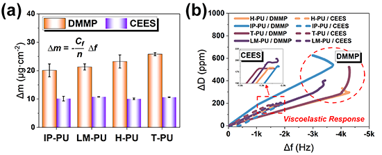 图5 DMMP和CEES在聚氨酯薄膜上的吸附质量和粘弹性响应变化
