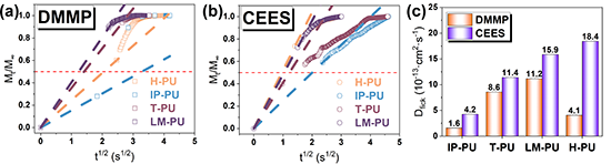 图6 DMMP和CEES在聚氨酯薄膜上的瞬时吸附行为和扩散系数Dfick