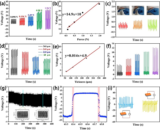 图2. PAN多层复合纤维膜的开路电压:(a)在不同的力下,(b)力-电压线性图,(c)手指不同弯曲角度,(d)不同厚度,(e)厚度-电压线性图,(f)不同接触面积。(g)压缩?释放6000 次循环。(h)反应时间和恢复时间。(i)反向和正向连接。