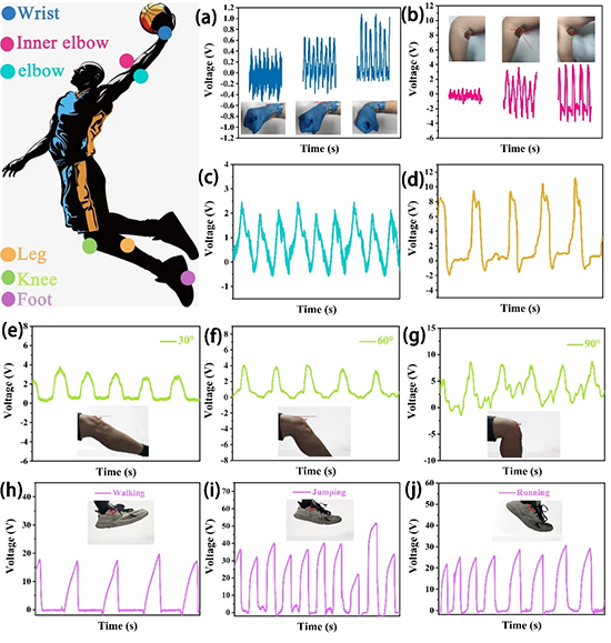 图5. PAN多层纤维复合膜的开路电压:(a)手腕,(b)内肘、(c)肘、(d)腿、(e)-(g)膝弯曲不同的角度;(h)-(j)不同行走姿势。