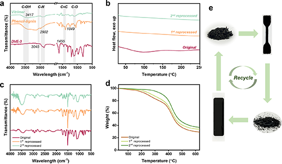 图 4.多酚木质素vitrimer结构、热稳定性及回收过程。