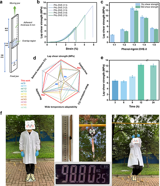 工业胶黏剂应用广泛,其生产量和消费量巨大。传统的胶黏剂工业对石化原料依赖度较高,随着能源危机和环境问题的日益严重,开发可再生替代原料、设计具有重复使用性能的胶黏剂势在必行。木质素是制浆造纸、生物质精炼工业的主要副产物,其天然多酚结构具有一定的粘附性能,被认为是开发绿色胶黏剂的最理想原料之一。但常见的工业木质素通常经历剧烈的化学反应过程,分子结构高度缩合、反应活性较差,难以制得具有高强度的胶黏材料。而通过进一步化学改性获得的高强度木质素胶黏剂,通常依赖稳定的交联网络,难以同时实现高粘合强度和可重复使用性。