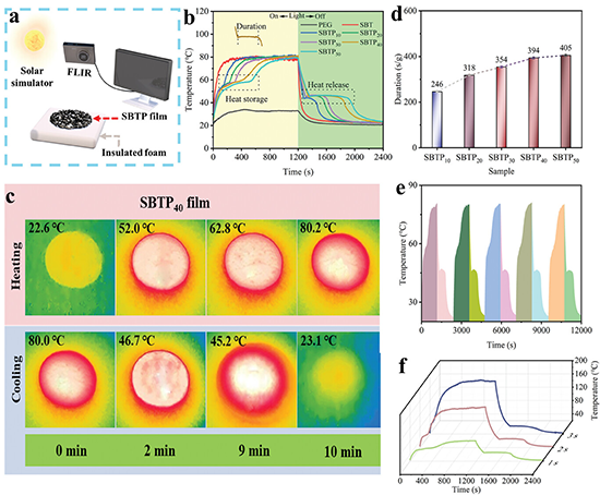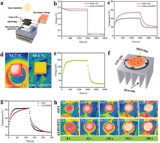 近期,东华大学张圣明博士后、陈仕艳和王华平教授团队以细菌纤维素(BC)为载体材料,甲基三甲氧基硅烷(MTMS)为一级交联剂,羟基化碳纳米管(HCNT)为二级交联剂和光热材料,PEG为相变材料,采用最简单的一步原位合成法制备了一种具有交联网络结构的多功能硅烷化BC/HCNT/PEG (SBTP)复合光热膜(图1)。简化了复合光热膜的制备流程,实现了BC网络的增强,HCNT的优良分散性以及PEG分子链的直接引入和完美互锁。因此,最佳的SBTP光热复合膜展现优异的热诱导柔韧性、可定制性、改善的机械性能、可调节的亲水性和提高的热导率(图2)。此外,最佳的SBTP薄膜还表现出145.1 J g?1的高热焓,超过94%的焓效率,优异的形状稳定性和<1.2%的低泄漏 (图3)。同时,它还显示出超过80 °C的高光热转换能力,394 s g?1 的高光热存储能力和优异的热存储稳定性 (图4)。因此,当将其用于太阳能-热能-电能转换时,SBTP膜在3个太阳照射下可显示出423 mV的最大输出电压,30.26 W m?2的功率密度以及优异的循环稳定性 (图5)。更有意义的是,它还可以应用于太阳能电池和LED芯片的热管理,并将余热转化为电能,展现出多场景应用能力 (图6)。该工作以“One-Step Synthesis of Multifunctional Bacterial Cellulose Film-Based Phase Change Materials with Cross-Linked Network Structure for Solar–Thermal Energy Conversion, Storage, and Utilization”为题发表在《Small》期刊上。文章第一作者是东华大学材料科学与工程学院2021级博士研究生张冬。该研究得到国家自然科学基金委的支持。