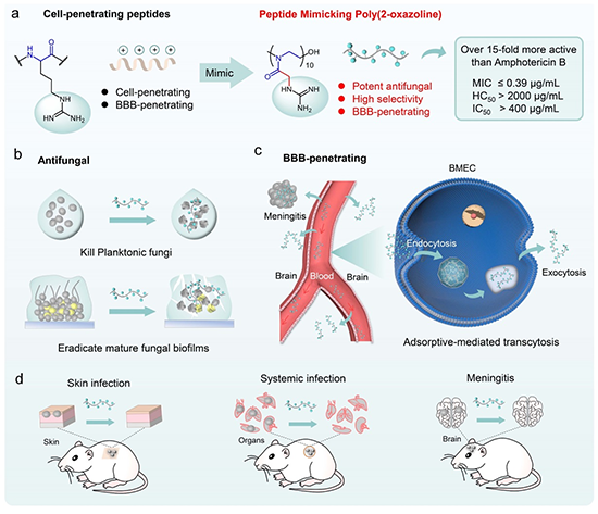 近期,刘润辉教授课题组通过模拟细胞穿透肽多聚精氨酸的策略设计合成了侧链胍基的聚噁唑啉分子,抗真菌活性甚至优于大多数临床抗真菌药物,且兼具高效的血脑屏障穿透性能,并在真菌系统感染和真菌性脑膜炎中表现出良好的治疗效果,为脑膜炎治疗药物的研究提供了新思路。该成果以“Peptide-mimicking poly(2-oxazoline)s possessing potent antifungal activity and BBB penetrating property to treat invasive infections and meningitis”发表在Journal of the American Chemical Society (J. Am. Chem. Soc., 2023, DOI: 10.1021/jacs.3c09240)。