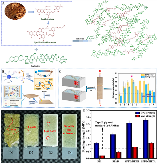 图4. (A) SM/BEP 胶黏剂的固化过程。(B) 矿化 SP 基胶黏剂的合成及其在胶合板上的应用示意图。(C) 在胶合板上使用原始 SP 和改性 SP 基胶黏剂的机械测试流程和粘合强度示意图。 (D) 不同大豆蛋白基胶黏剂样品的形态:(D1)SPI,(D2)SPI/D,(D3)SPI/D/BEPH,(D4)SPI/D/BHTA。(E) 不同大豆蛋白基胶黏剂样品的干、湿粘合强度。
