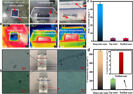 图5. (a) PNIPAm/CMC/CMCNT水凝胶漂浮在东湖和自然阳光驱动的清水产生图像。(b)PNIPAm/CMC/CMCNT水凝胶处理湖水前后的显微图像。PNIPAm/CMC/CMCNT水凝胶净化处理前后东湖水的TOC含量(c)和电导率(d)。
