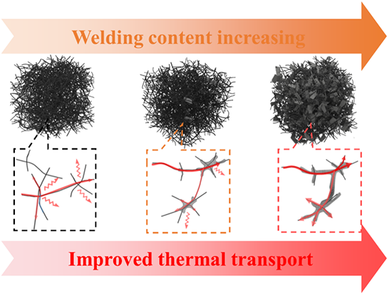 随着微电子器件的高度集成和小型化,迫切需要先进的热界面材料来更有效地解决运行中的热管理问题。聚合物基材料因其优异的柔韧性、轻质、优异的加工性能和低成本而在高功率微电子器件的热管理领域引起了广泛的关注。具有高导热性的填料增强的聚合物纳米复合材料由于其优异的机械适应性、突出的加工性能和优异的柔韧性,在下一代电子器件的热管理方面显示出广阔的前景。然而在低负载情况下保持复合材料柔性的同时实现高导热率仍然是一个挑战,一个主要原因是填料颗粒之间的界面热阻严重阻碍了纳米复合材料导热率的进一步提高。本研究提出结构焊接策略来提升纳米复合材料的热导率,通过实验加模拟研究复合材料内部微观界面的热传输行为。以碳纳米管(CNT)网络作为导热填料,通过碳源浸渍和热退火策略构建了由不同石墨结构(GS)焊接的CNT网络(GS-w-CNT)。将其与聚二甲基硅氧烷纳复合后,系统地研究GS与CNT界面焊接后对CNT纳米复合材料热导率的影响。同时进行分子动力学模拟,对界面焊接的GS与CNT网络结构之间的界面热阻,界面结合能以及声子耦合进行了探究。