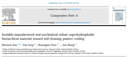 原文信息与链接:Haoxuan Sun, Fan Yang, Shuangjun Chen, Jun Zhang. Scalable-manufactured and mechanical-robust superhydrophobic hierarchical material toward self-cleaning passive cooling[J].Composites Part A, 2023, 175:107750.