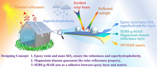 图1 超疏水型被动降温多层复合材料作用及组成示意图