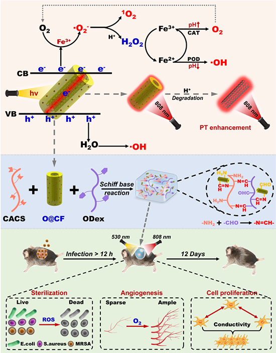 近期,东华大学先进低维材料中心王义团队制备了一种由碳纳米管上包覆掺杂Fe3+的共价有机骨架涂层(COF)的纳米复合物组合的多功能水凝胶,用于综合治疗细菌性糖尿病伤口(图1)。首先,通过界面聚合生长合成了均匀的COF包覆氧化碳纳米管(OCNT)(O@C),然后通过 "Fe-N配位 "将Fe3+掺杂到COF层的多孔骨架中,得到金属配位管状纳米复合物OCNT@COF-Fe(O@CF)。研究发现,涂覆在 COF 中的碳纳米管可以作为分子间电荷转移通道,从而缩小 COF 层的能带间隙、增强光吸收、提高光生电荷分离和迁移。同时,Fe3+配位具有作为电子受体的能力,进一步优化了 O@CF 复合物的能带间隙,降低了光生载流子的重组。此外,多孔 COF 中的 Fe3+ 被发现是促进底物(O2 和 H2O)吸附、增强活性的位点,从而实现了有效利用光诱导的电子-空穴对同时生成超氧阴离子自由基(