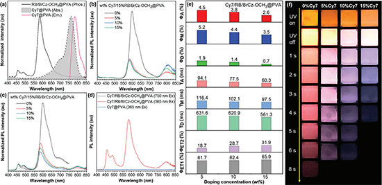 图6. 逐步共振能量转移体系Cy7/RB/BrCz-OCH3@PVA的光物理性质