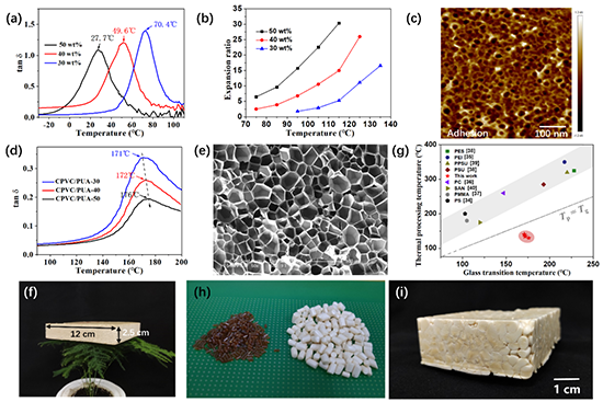 随着社会的高速发展,人们对聚合物材料的使用性能提出了更高的要求,同时这些材料引起的环境污染问题也引起了人们越来越多的关注。聚合物材料的全生命周期设计成为了一种有效的解决方案,其中包括实现材料制备过程的节能化、功能应用的高性能化以及服役后的可利用性。为此,近年来,中国科学院长春应用化学研究所唐涛研究员课题组将反应性增塑和反应诱导相分离与超临界CO2发泡技术相结合,提出了“增塑-发泡-增强”(PFR)结构功能一体化策略,成功制备出兼具高性能和可再加工性的聚氯乙烯/聚脲纳米复合泡沫(Chem. Eng. J. 2022, 450, 138071.)、聚苯醚/聚脲纳米复合泡沫(Compos. Commun. 2023, 40, 101589.)以及苯乙烯-丙烯腈共聚物/聚脲纳米复合泡沫(Compos. Part B 2023, 264, 110908.)。PFR策略不仅可以显著改善聚合物的熔融加工性和超临界发泡性能,而且由于原位形成了独特的纳米级海-岛微相分离结构,所得纳米复合泡沫展现出优异的机械性能、耐溶剂性、形状记忆以及可再加工性,实现了材料结构设计上热塑性与热固性的有机结合。这类轻质高强泡沫材料在航空、航天、舰船、陆上交通运输、建筑等领域具有广阔的应用前景。