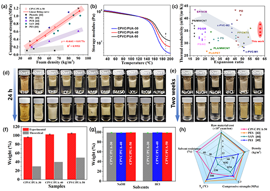图3 CPVC/PUA纳米复合泡沫的机械性能、隔热性能、耐溶剂性能和耐强酸强碱性