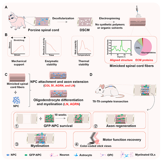 研究团队首先对猪脊髓进行一系列的理化处理,去除细胞成分,获得脊髓脱细胞外基质(decellularized spinal cord matrix , DSCM)。随后,团队建立了不含有机溶剂和合成高分子的细胞外基质的静电纺丝单纺技术,制备出微纳米级脊髓脱细胞基质有序纤维(aligned decellularized spinal cord fibers, A-DSCF)。通过蛋白组学分析,显示A-DSCF保留多种与轴突发生、细胞贴附、神经元透射、髓鞘化相关的生物学过程相关的外基质蛋白。