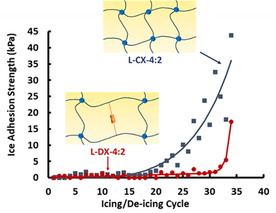 针对滑液损耗所造成的除冰耐久性差的问题,团队提出一种在NP-GLIDE涂层基体中构筑共价交联和氢键交联相结合的双交联网络(DX)的设计思路。团队认为,由于氢键交联具有动态性,滑液的损耗可能引起DX涂层基体中氢键结合点彼此靠近,从而使氢键交联密度增加,进而导致更多的滑液析出至涂层表面。这一过程可能一直存在,直至基体中滑液损耗完全。因此,DX涂层将表现出比CX更长久的除冰性能。在此提到的CX涂层就是常规的NP-GLIDE涂层,仅由共价键交联形成。