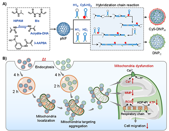 图1. A) DNA纳米颗粒的构建(线粒体靶向DNA纳米颗粒,Cy5-DNPM;互补DNA纳米颗粒,DNPC)。B) 细胞内DNA纳米颗粒顺序组装实现线粒体干预。