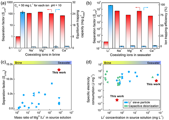 据报道,海水中拥有着超过2300亿吨尚未开发的锂资源,其储量远远超过陆地上的锂资源总和(约1400万吨),从海水中提取锂极有希望解决日益严重的锂资源短缺和日益增长的锂资源供应需求之间的冲突。近年来,研究者已经开发出多种从海水中提取锂的材料和技术,包括纳滤分离、电化学提取和锂离子筛吸附。尽管这些工作取得了显著的进展,但现有的锂提取技术仍存在一些根本性的问题,如Li+捕获速率有限、浓度极化和结垢严重、能耗高。此外,由于海水中的锂离子(Li+)浓度极低(~ 0.2 mg?L-1),而且存在大量干扰离子(500 ~ 10000 mg?L-1),这些问题将变得更加明显。如何以节能的方式实现从海水中高效、持久地提取锂仍然是一项艰巨的挑战。