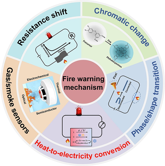 火灾是威胁人类生命和财产安全的主要灾害之一,随着现代轻质可燃物的大规模应用,火灾安全的预警与防护更加严峻。因此,开发可靠的火灾预警系统对火灾的有效检测和监控非常重要。根据作用机理,可以将目前的火灾预警材料分为气体/烟雾传感器、热敏电阻材料、热致变色、热致形变/相变和热电材料等。其中,热电材料基于独特的热-电相互转换特性、电信号与温差之间的良好线性关系以及自供能能力等,引起极大关注。近期,深圳大学陈光明特聘教授课题组联合杭州师范大学汤龙程教授在《Science Bulletin》上发表了题为《Thermoelectrics and thermocells for fire warning applications》的综述论文,系统总结评述了热电火灾预警材料的研究现状及未来趋势。深圳大学2022级博士生丁招福为第一作者,深圳大学陈光明特聘教授、梁丽荣助理教授和杭州师范大学汤龙程教授为共同通讯作者。