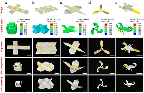近日,南方科技大学机械与能源工程系葛锜教授与西安交通大学原超副教授研究团队合作在《Nature Communications》杂志上报道了一种简单高效的陶瓷4D打印制造方法和设计策略。研究团队开发出了适用于DLP打印的光敏陶瓷弹性体浆料和丙烯酸水凝胶前驱体。光固化后的两种材料均可实现较大的变形,其中陶瓷弹性体生坯可承受高达700%的拉伸应变;水凝胶在失水过程中可实现高达65%的体积收缩率,同时伴有40倍以上的模量增加。采用团队自主开发的MultiMatter C1型多材料光固化3D打印设备打印水凝胶-陶瓷弹性体层合结构,通过水凝胶失水驱动层合结构由平面图案直接演化为复杂三维结构,在无需额外形状编程的条件下实现陶瓷结构的直接4D打印。