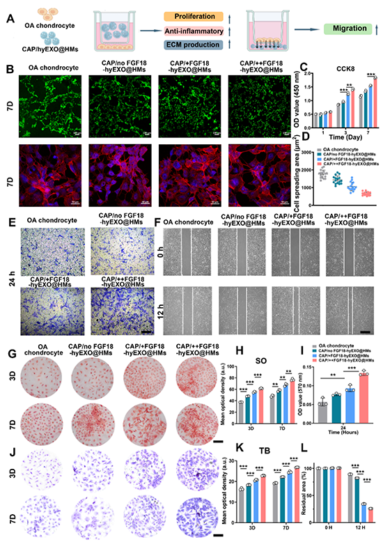 图5.CAP/++FGF18-hyEXO@HMs促进OA软骨细胞的增殖、迁移和ECM合成