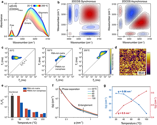 基于时温等效原理,作者利用二维相关红外光谱、变温低场核磁和SAXS探究了离子皮肤中多级氢键与凝胶点状态之间的关系。研究发现,随温度升高,二元氢键和寡聚氢键逐步解离,游离COOH逐步增多,表明体系中确实存在多级氢键聚集体的逐步解缔合。同时,体系链缠结逐步增强,与氢键解离形成互补交联。