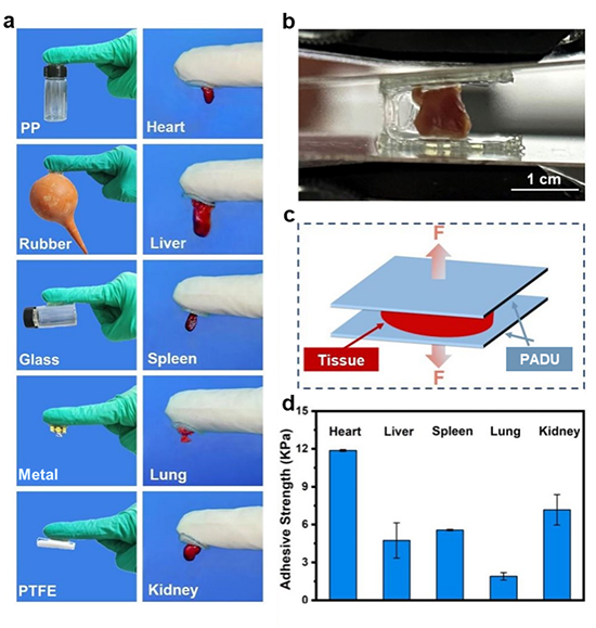 智能柔性敷料的皮肤粘附性可以保证柔性器件与皮肤的充分接触,提升器件对生理信号监测的准确性。本文中,智能柔性敷料柔性衬底(PADU)设计采取多重氢键的湿粘附机制来提升材料对皮肤等组织表面的粘附作用(图2)。其中PADU衬底对糖尿病和健康小鼠皮肤均表现出良好的粘附性,粘附强度超过13 kPa,表明PADU适合作为智能柔性敷料的衬底,以保证敷料与皮肤的紧密贴合。