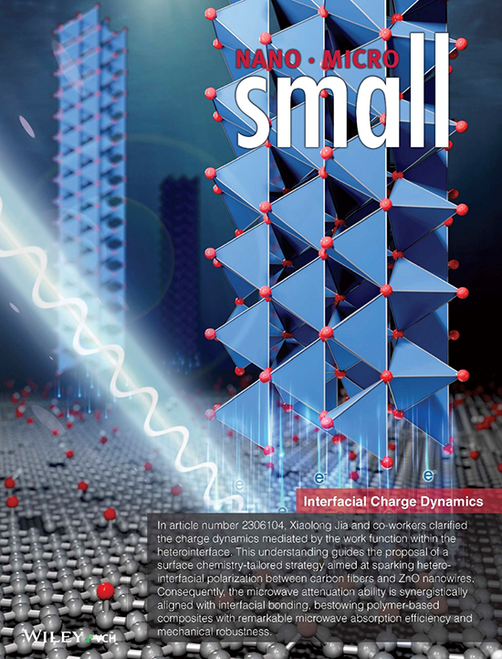 基于此,北京化工大学贾晓龙教授、杨小平教授团队报道了一种界面电荷运动介导的极化强度调控策略,通过引入氧化锌纳米线界面相以协同改善再生碳纤维复合材料的阻抗匹配、提高电磁损耗能力、增强界面结合,并基于再生碳纤维表面化学官能团调控来强化再生碳纤维-氧化锌异质界面极化强度,从而协同提升了极化损耗能力和界面键合强度,解决了吸波性能和力学性能间的矛盾,实现了复合材料结构-吸波一体化,拓展了吸波材料的应用场景,提升了再生碳纤维复合材料的再利用价值。相关研究成果以“Charge Dynamics Engineering Sparks Hetero-Interfacial Polarization for an Ultra-Efficient Microwave Absorber with Mechanical Robustness”为题发表在了《Small》上,并被选为期刊内封。合肥工业大学电气学院讲师还献华为第一作者,通讯作者为北京化工大学材料学院贾晓龙教授。
