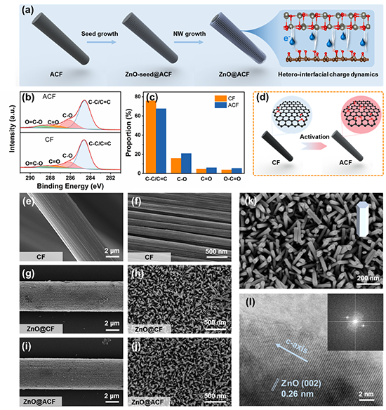 图1. 再生碳纤维-氧化锌纳米线异质结构制备及界面电荷调控策略示意图(a)、碳纤维表面化学官能团及形貌结构表征(b-l)